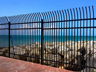 A picket fence formed of relatively thin-walled rectangular cross-sectioned tubular-steel posts, rails and pickets, with holes in the posts receiving the ends of the rails and with holes in the rails receiving the ends of the pickets. Tubular picket fence this through picket style with a pressed spear adorning the top not only provides the classic look by which it gets its name, it is also one of the more popular aluminum fences around, bringing an aesthetically pleasing visual appeal to your property. Spear-top picket Fence is one of the more fashionable decorative, metal fences on the market and is available in 2 or 3 rails with a flush bottom rail option, as well. Decorative rings and scrolls can be added for an even more ornamental look.